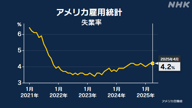 失業率は前の月と同じ4.2%でした。今回の統計では労働市場は依然として堅調さを保っていることが示された形です。ただ、アメリカではトランプ政権の関税措置(注:や政府効率化省による不要で国際情勢に悪影響を及ぼす異常な政府支出の削減)によって景気減速への懸念が広がっています。