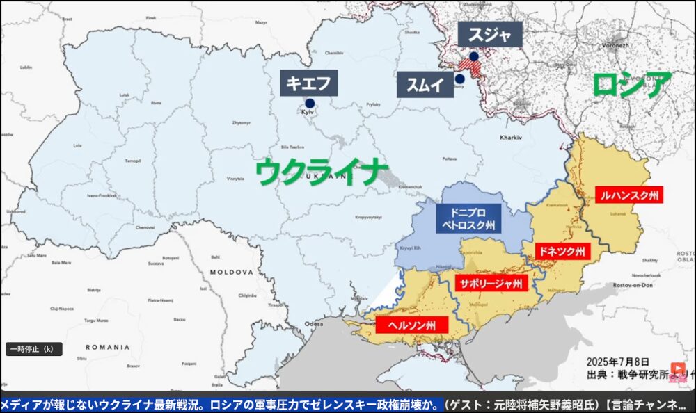 元陸将補矢野義昭氏によると、ロシア軍はルガンスク州、ドネツク州、ザポリージャ州、ヘルソン州を併合しているが、スミ州やドネプロペトロフスク州、ハリコフ州、オデッサ州などに併合の前段階になる緩衝地帯を形成している。また、クラマトルスクやコンスタンチノフカ、トレツク、ポクロウシクといったウクライナ軍の要衝を猛攻撃している。特に、トレツクは陥落寸前であり、コンスタンチノフカやウクライナ東部最大の要衝であるポクロウシクもロシア軍によって東西から挾撃、包囲されており、陥落寸前の状態になるのも間近だと言う。