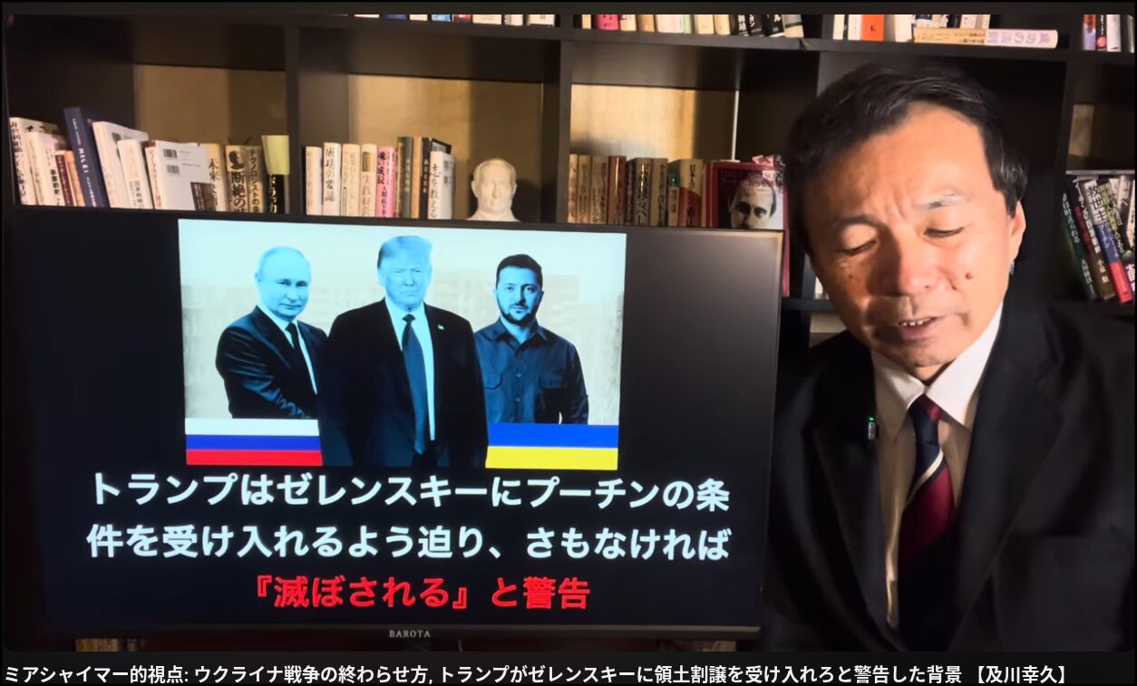 トランプ大統領はフィナンシャル・タイムズの報道は正しくないと発信しているが、オールドメディアやインターネットのSNSによると、トランプ大統領とゼレンスキー氏との会談は大喧嘩になったようだ。Youtubeチャンネル・「THE CORE」を解説している参政党のブレーンで国際情勢アナリストの及川幸久氏の「ミアシャイマー的視点: ウクライナ戦争の終わらせ方, トランプがゼレンスキーに領土割譲を受け入れろと警告した背景」(https://www.youtube.com/watch?v=jPrX8yOr0wg&t=1028s)では、動画の中で次のひとコマを発信している。