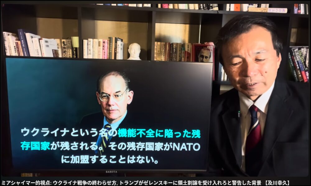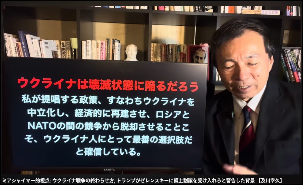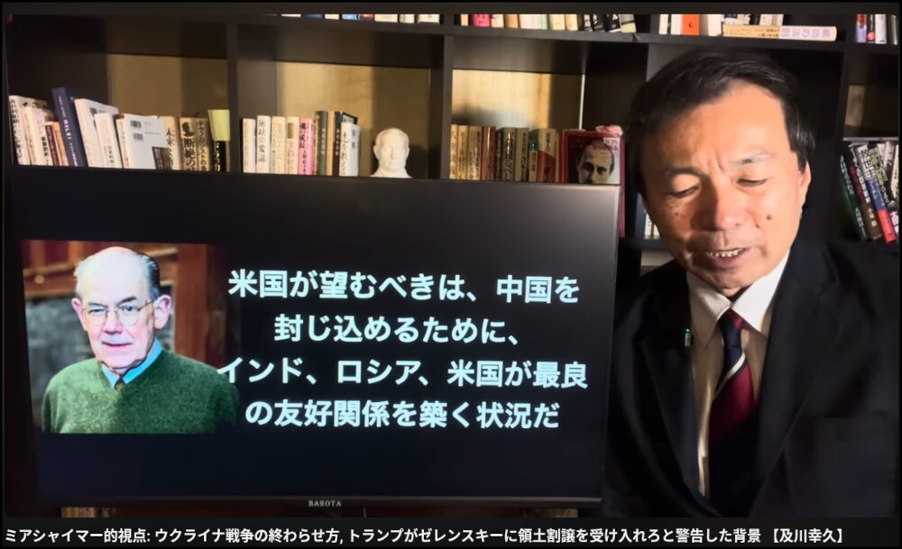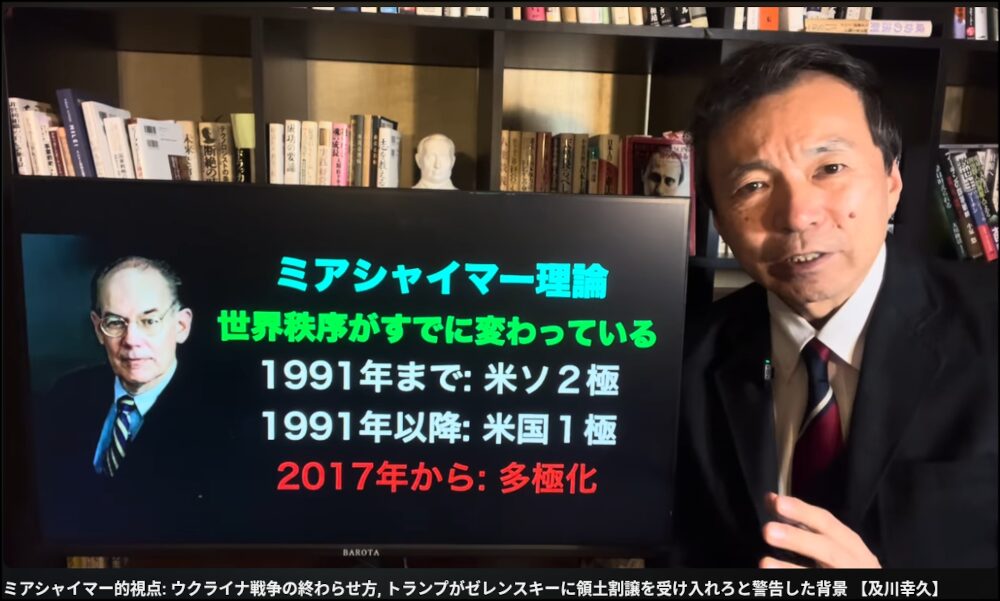 そうなると、今後のウクライナ情勢および世界情勢はどうなるのか。これについて、及川幸久氏はシカゴ大学の国際政治学者であるミアシャイマー教授(https://x.gd/mcR4A)の政治理論を利用して、次のキャプチャ図のように説明している。現実主義者のミアシャイマー教授によると、世界は米国単独覇権主義体制から2017年以降、多極体制に突入したとしており、これが同教授の現実主義の原点になる。同教授は、2015年の9月25日に既に次のような講演を行ったと言う。