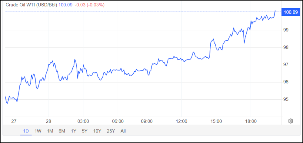 現在(日本時間4月29日20時10分)のWTI先物価格のチャート(1日)は次の通り(https://jp.tradingeconomics.com/commodity/crude-oil)。トランプ大統領がイランの提案を拒否すると見て、1バレル=100ドルを突破している。